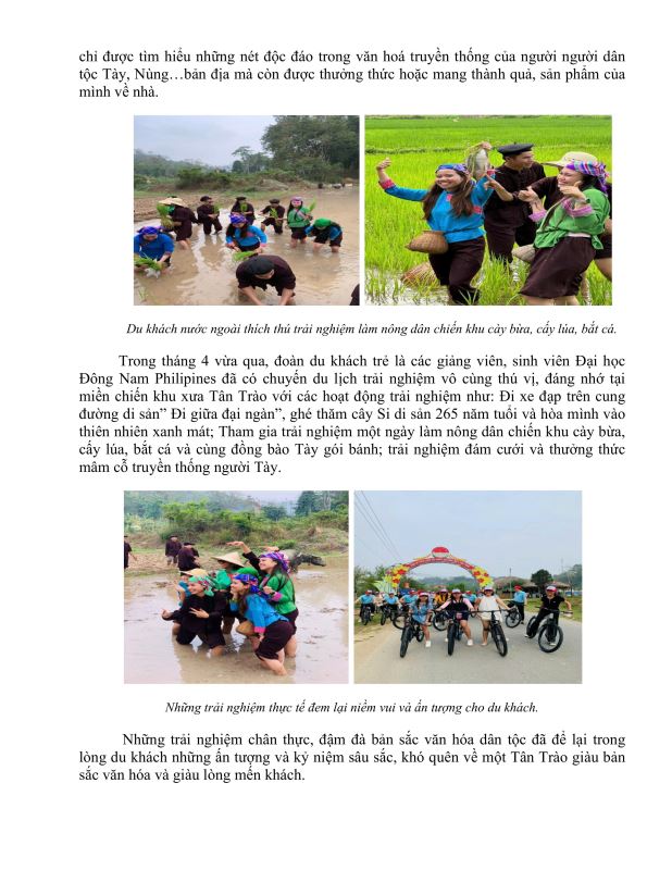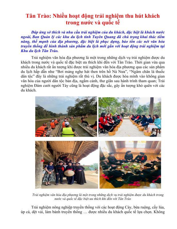 Đáp ứng sở thích và nhu cầu trải nghiệm của du khách, đặc biệt là khách nước ngoài, Ban Quản lý các khu du lịch tỉnh Tuyên Quang đã chú trọng khai thác tiềm năng, thế mạnh của địa phương, đặc biệt là phục dựng, bảo tồn các nét văn hóa truyền thống để hình thành sản phẩm du lịch mới gắn với hoạt động trải nghiệm tại Khu du lịch Tân Trào.