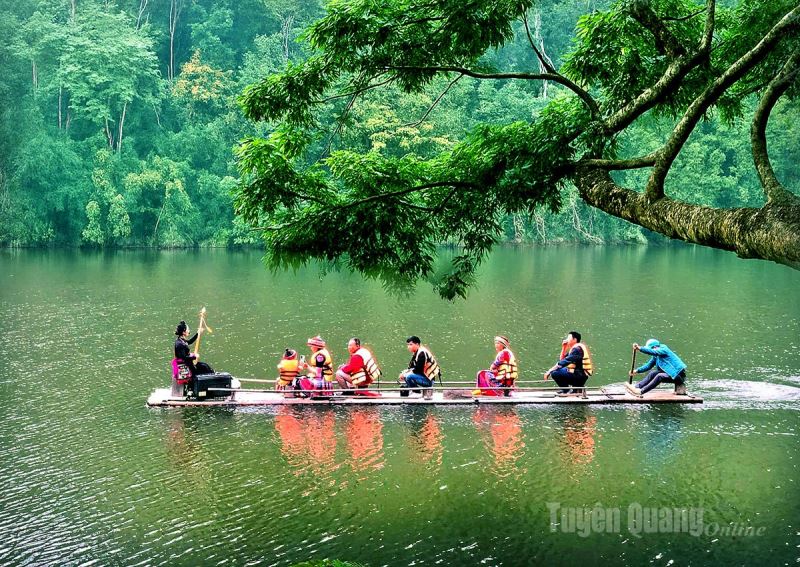 Ngồi trên mảng giữa hồ Nà Nưa, du khách lắng nghe làn điệu hát Then - một trải nghiệm thú vị.