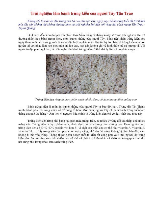 Không chỉ là món ăn đặc trưng của bà con dân tộc Tày, ngày nay, bánh trứng kiến đã trở thành một đặc sản không thể không thưởng thức và trải nghiệm khi đến với vùng đất cách mạng Tân Trào - Tuyên Quang.