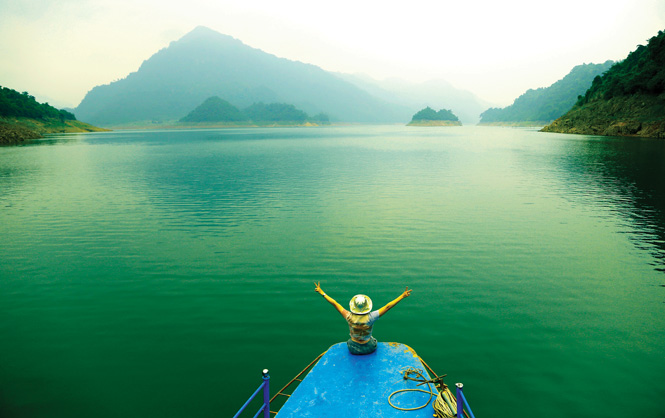 Du khách đi thuyền ngắm cảnh Khu bảo tồn thiên nhiên quốc gia Na Hang - Lâm Bình.