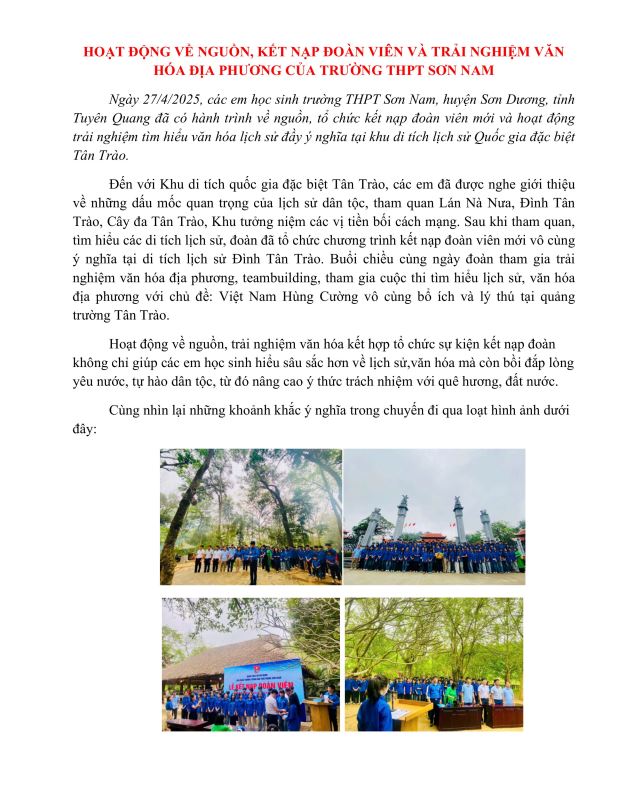 Ngày 27/4/2025, các em học sinh trường THPT Sơn Nam, huyện Sơn Dương, tỉnh Tuyên Quang đã có hành trình về nguồn, tổ chức kết nạp đoàn viên mới và hoạt động trải nghiệm tìm hiểu văn hóa lịch sử đầy ý nghĩa tại khu di tích lịch sử Quốc gia đặc biệt Tân Trào.