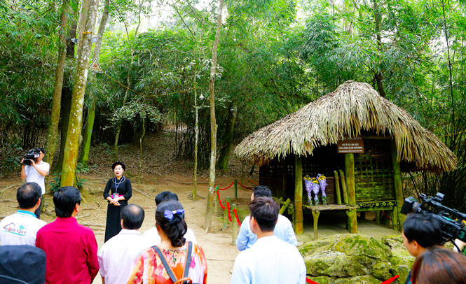 Du khách nghe thuyết minh về quá trình Chủ tịch Hồ Chí Minh sống và làm việc tại lán Nà Nưa (ảnh chụp khi chưa có dịch Covid-19).