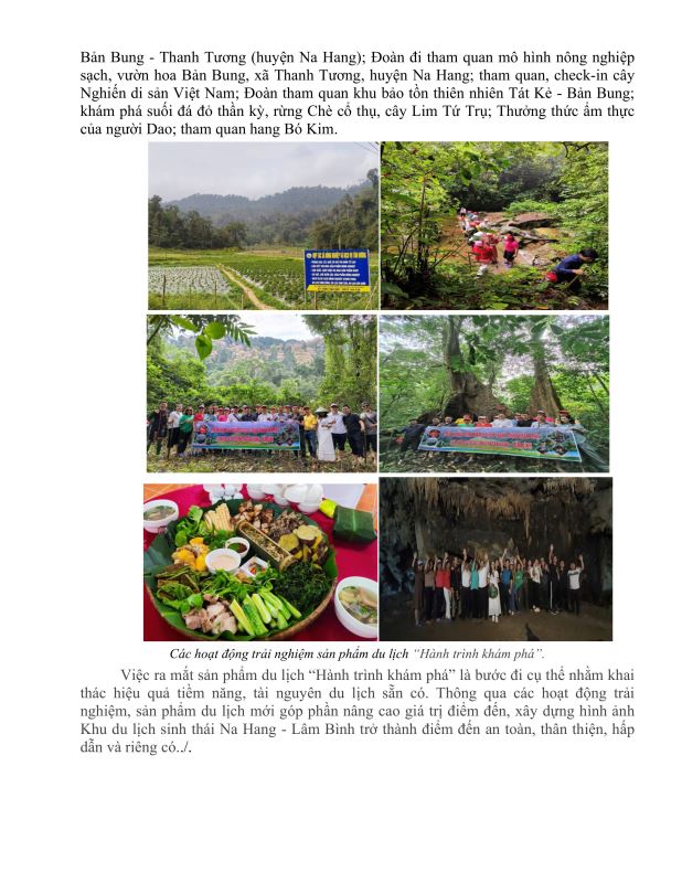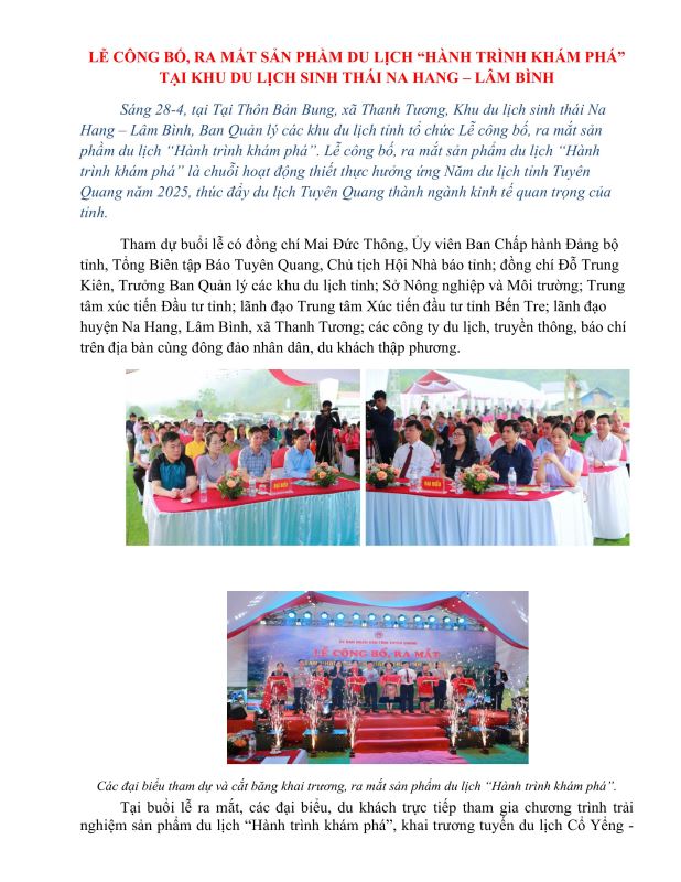 Sáng 28-4, tại Tại Thôn Bản Bung, xã Thanh Tương, Khu du lịch sinh thái Na Hang – Lâm Bình, Ban Quản lý các khu du lịch tỉnh tổ chức Lễ công bố, ra mắt sản phầm du lịch “Hành trình khám phá”. Lễ công bố, ra mắt sản phẩm du lịch “Hành trình khám phá” là chuỗi hoạt động thiết thực hưởng ứng Năm du lịch tỉnh Tuyên Quang năm 2025, thúc đẩy du lịch Tuyên Quang thành ngành kinh tế quan trọng của tỉnh.