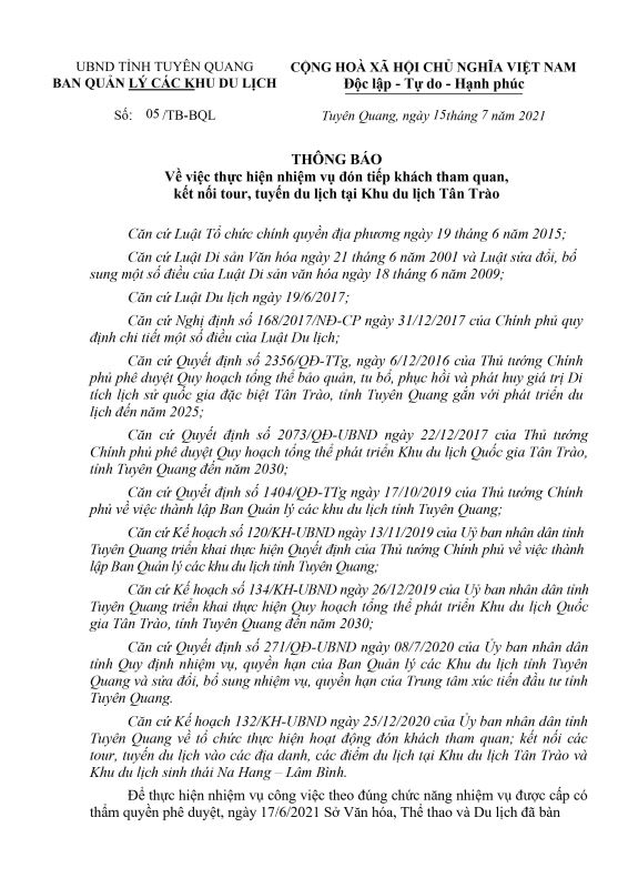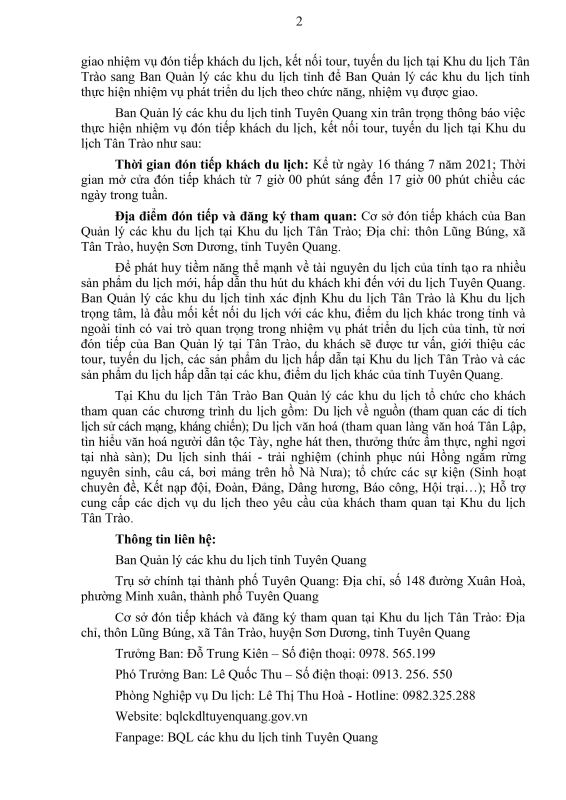 Để thực hiện nhiệm vụ công việc theo đúng chức năng nhiệm vụ được cấp có thẩm quyền phê duyệt, ngày 17/6/2021 Sở Văn hóa, Thể thao và Du lịch đã bàn giao nhiệm vụ đón tiếp khách du lịch, kết nối tour, tuyến du lịch tại Khu du lịch Tân Trào sang Ban Quản lý các khu du lịch tỉnh để Ban Quản lý các khu du lịch tỉnh thực hiện nhiệm vụ phát triển du lịch theo chức năng, nhiệm vụ được giao. Ban Quản lý các khu du lịch tỉnh Tuyên Quang xin trân trọng thông báo việc thực hiện nhiệm vụ đón tiếp khách du lịch, kết nối tour, tuyến du lịch tại Khu du lịch Tân Trào